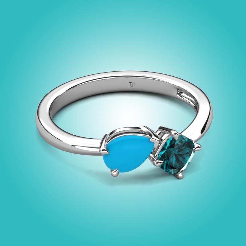 • 1 Turquoise Pear Shape 0.35 ctw/7x5 mm and 1 London Blue Topaz Cushion Shape 0.75 ctw/5.00 mm Two Stone Duo Engagement Ring set in a Prong Setting.