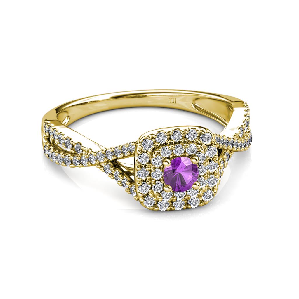 Designed to look sensational, this Engagement Ring consist of Center Amethyst wrapped by an exceptional Cushion Shape Double Halo with Diamond studded Infinity Shank, symbolizing your infinite love.