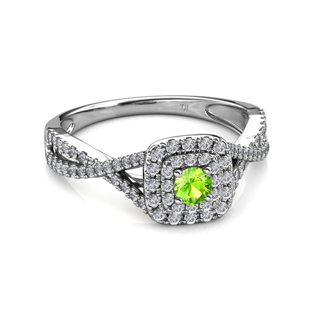 Designed to look sensational, this Engagement Ring consist of Center Peridot wrapped by an exceptional Cushion Shape Double Halo with Diamond studded Infinity Shank, symbolizing your infinite love.