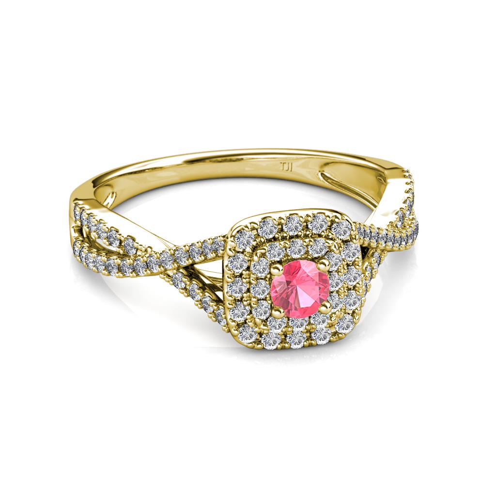 Designed to look sensational, this Engagement Ring consist of Center Pink Tourmaline wrapped by an exceptional Cushion Shape Double Halo with Diamond studded Infinity Shank, symbolizing your infinite love.