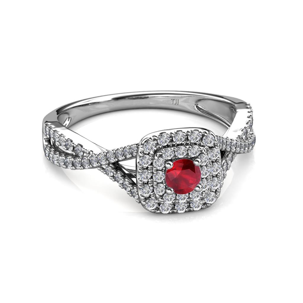 Designed to look sensational, this Engagement Ring consist of Center Ruby wrapped by an exceptional Cushion Shape Double Halo with Diamond studded Infinity Shank, symbolizing your infinite love.