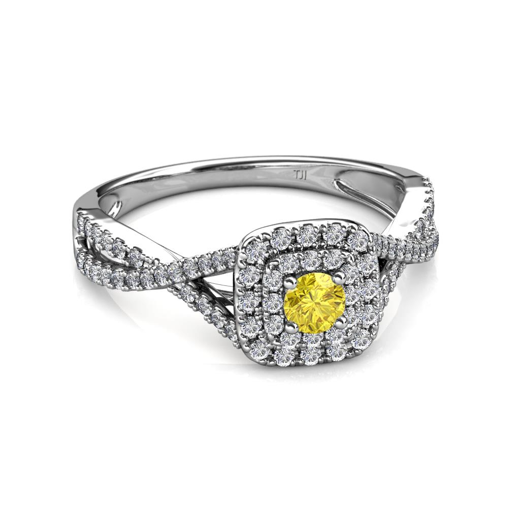 Designed to look sensational, this Engagement Ring consist of Center Yellow Sapphire wrapped by an exceptional Cushion Shape Double Halo with Diamond studded Infinity Shank, symbolizing your infinite love.
