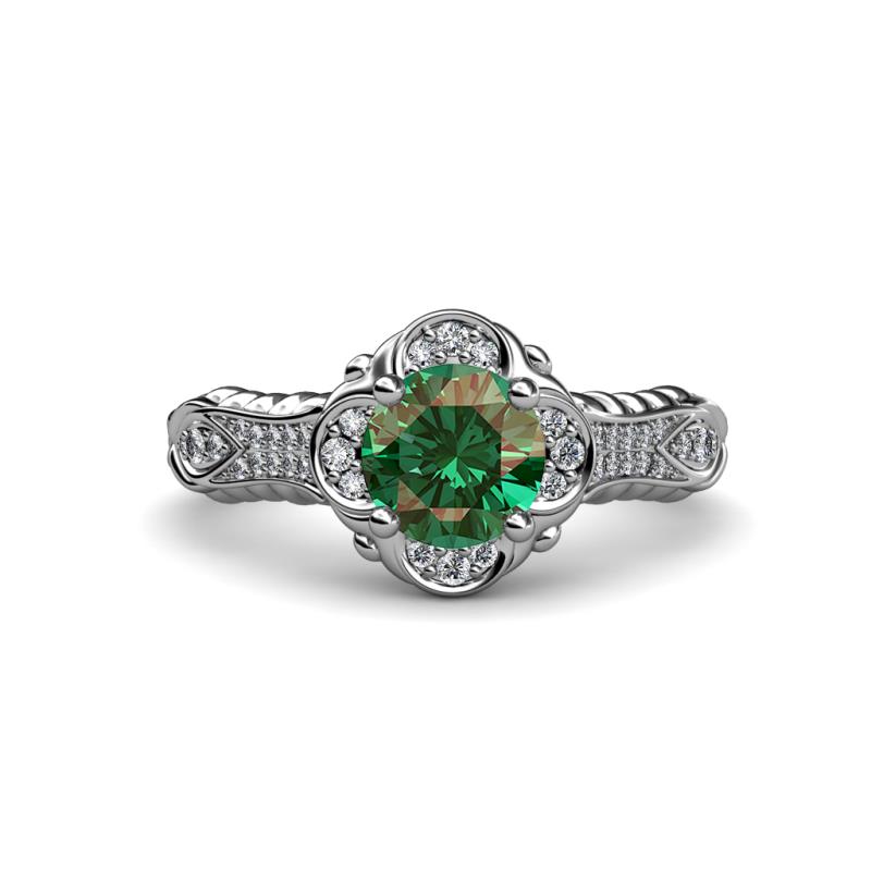 A vintage inspired ring with Center Lab Created Alexandrite crowned on floral halo of mined Diamonds while additional mined Diamonds and exquisitely elaborated bubble cable design adorn the shoulders & side, adding to the truly mesmerizing look.