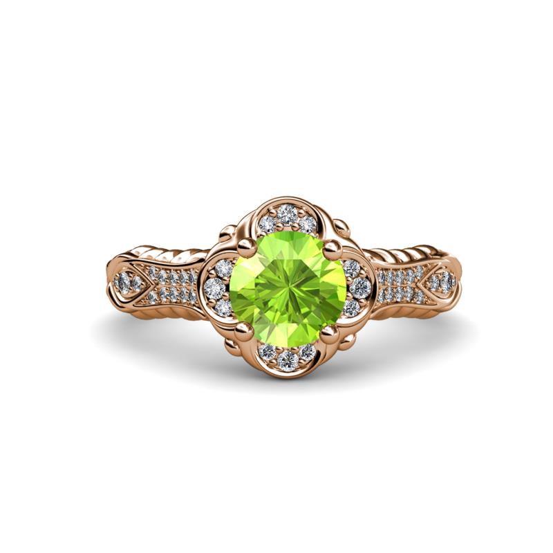 A vintage inspired ring with Center Peridot crowned on floral halo of mined Diamonds while additional mined Diamonds and exquisitely elaborated bubble cable design adorn the shoulders & side, adding to the truly mesmerizing look.