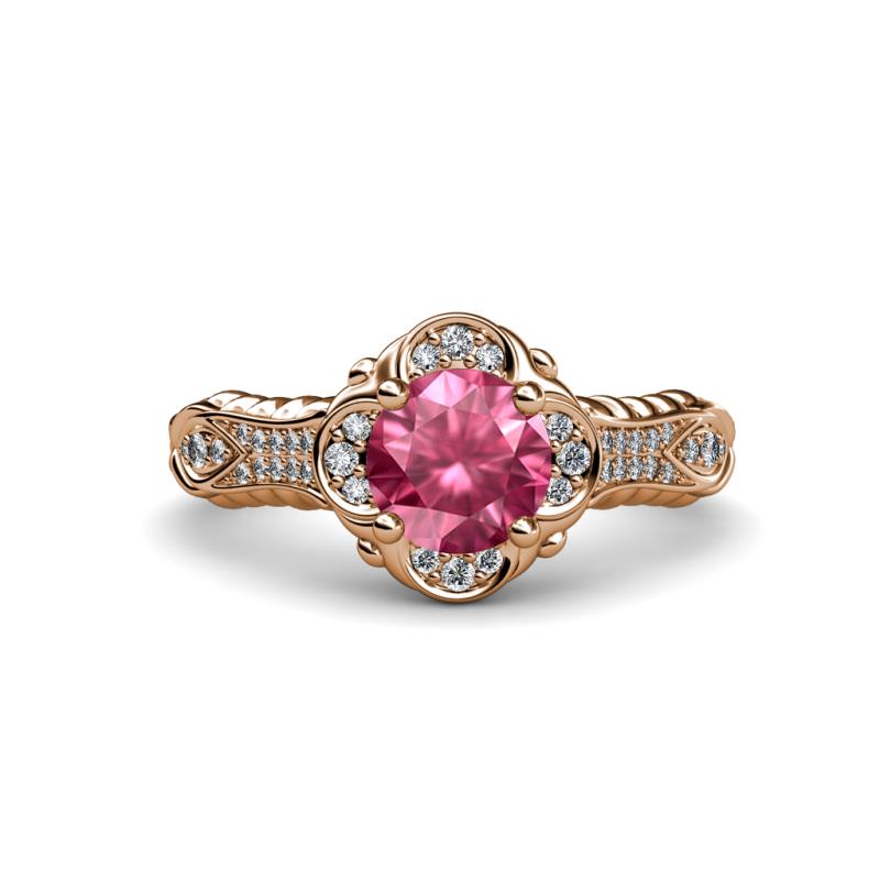 A vintage inspired ring with Center Pink Tourmaline crowned on floral halo of mined Diamonds while additional mined Diamonds and exquisitely elaborated bubble cable design adorn the shoulders & side, adding to the truly mesmerizing look.