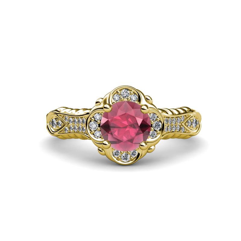 A vintage inspired ring with Center Rhodolite Garnet crowned on floral halo of mined Diamonds while additional mined Diamonds and exquisitely elaborated bubble cable design adorn the shoulders & side, adding to the truly mesmerizing look.