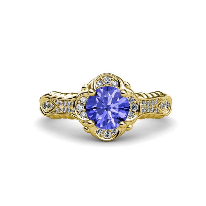 A vintage inspired ring with Center Tanzanite crowned on floral halo of mined Diamonds while additional mined Diamonds and exquisitely elaborated bubble cable design adorn the shoulders & side, adding to the truly mesmerizing look.