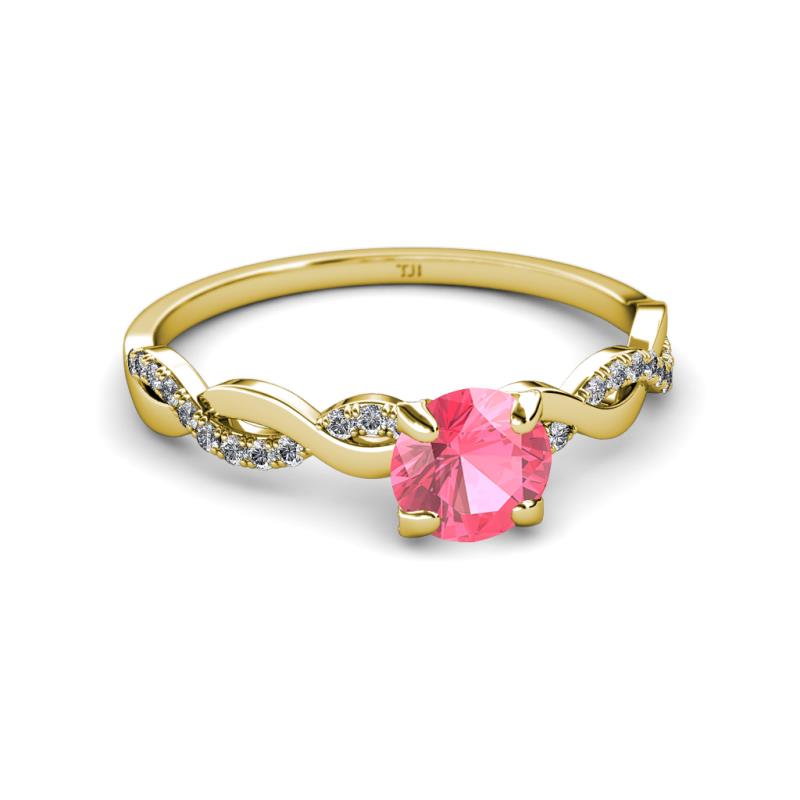 Get a meaningful Ring with Center Pink Tourmaline symbolizing your love, crowned upon the shank which twist together with Diamond ribbon forming infinity sign, indicating your unending love.
