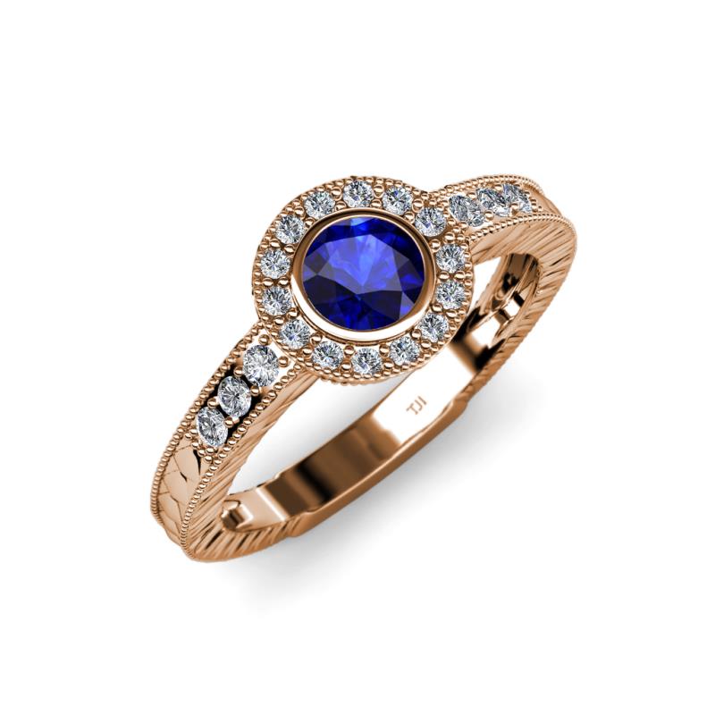 Blue Sapphire and Diamond Engraved Womens Halo Engagement Ring 0.77 ctw 14K Rose Gold More Details ...