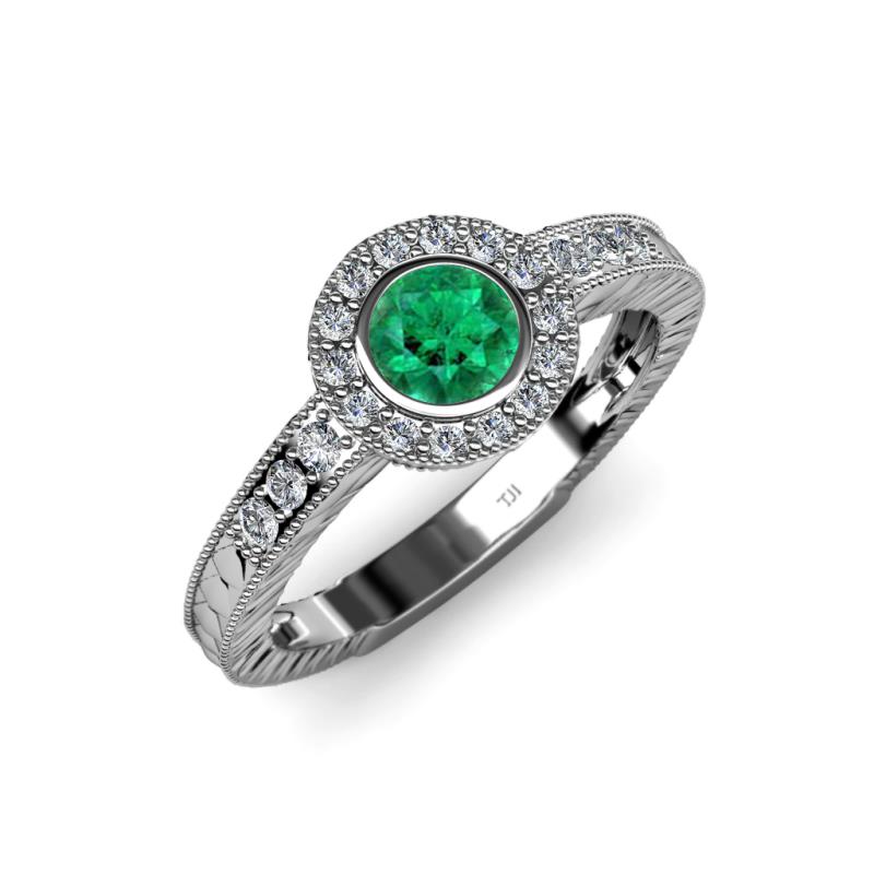 Emerald and Diamond Engraved Milgrain Womens Halo Engagement Ring 0.64 ctw 18K White Gold More Details ...