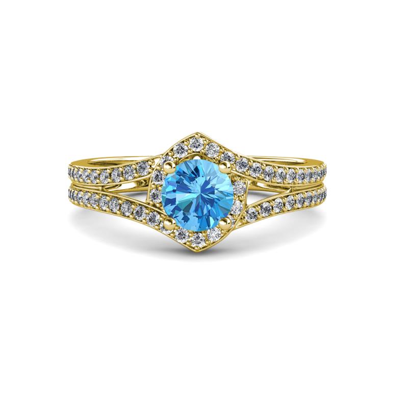 This Art Deco Peg Head Engagement Ring is designed with 4 Prong Round Center Blue Topaz and two row open Split Bypass Shank with Pave Set Diamonds will definitely sweep your love her off her feet.