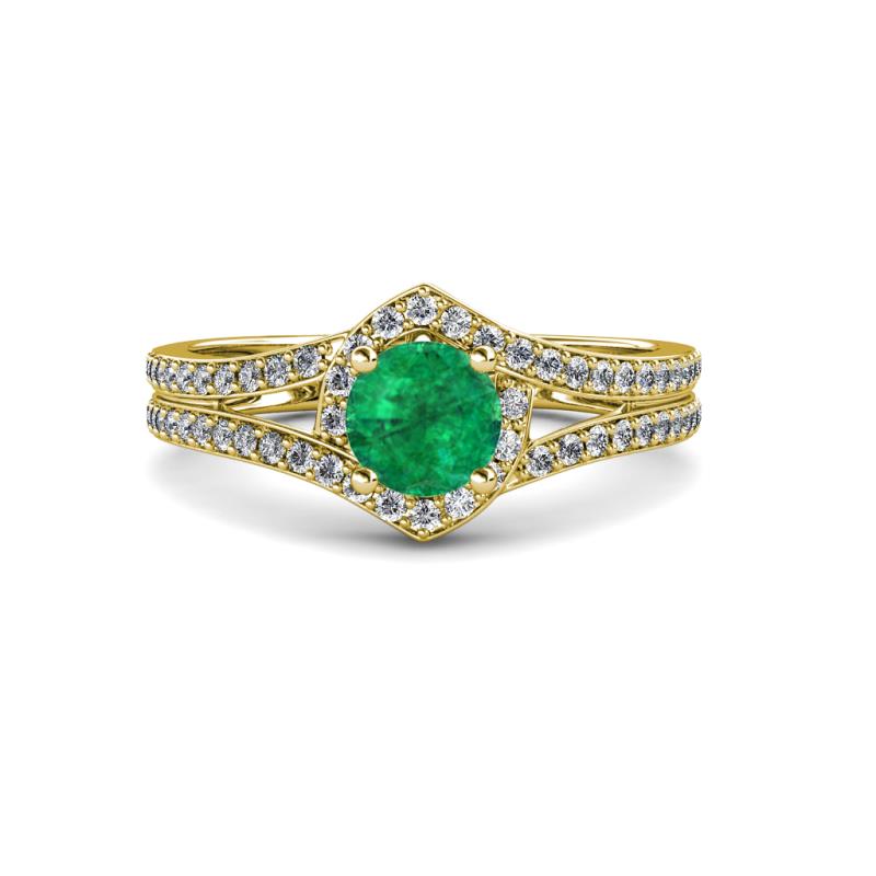 This Art Deco Peg Head Engagement Ring is designed with 4 Prong Round Center Emerald and two row open Split Bypass Shank with Pave Set Diamonds will definitely sweep your love her off her feet.