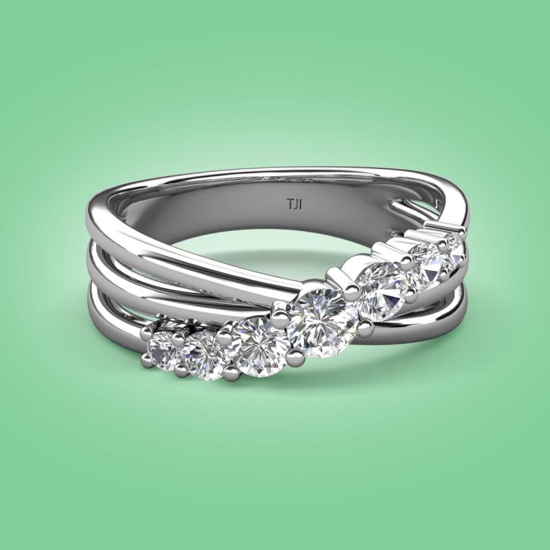 Make a statement with this stunning Wedding Band of 0.53 ctw featuring 7 sparkling Graduated Round White Sapphire set in a Prong Set with a crossover design, adding a touch of elegance and sophistication to any outfit.