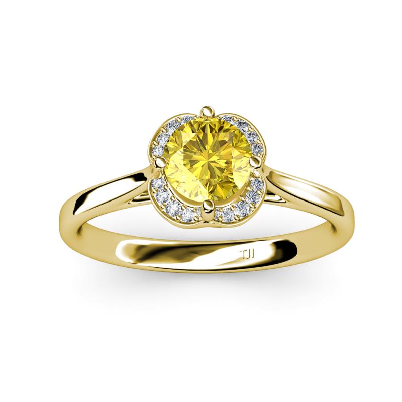 This is a Gorgeous 1.01 ct tw Floral Design Halo Engagement Ring with beautifully fitted Center Yellow Sapphire with Side Round White Diamond.