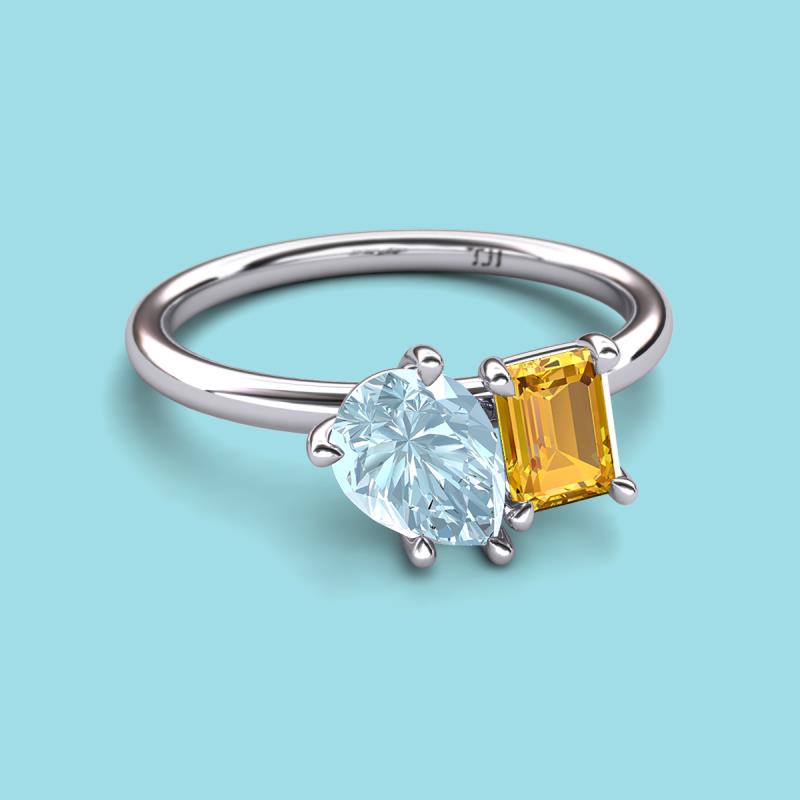 Find a beautiful symbol of everlasting love, with our new collection of duo two-stone ring. A pair of Pear Shape Aquamarine shimmering alongside of a luminous Emerald Shape Citrine crafted beautifully is all set to represent two of you together.