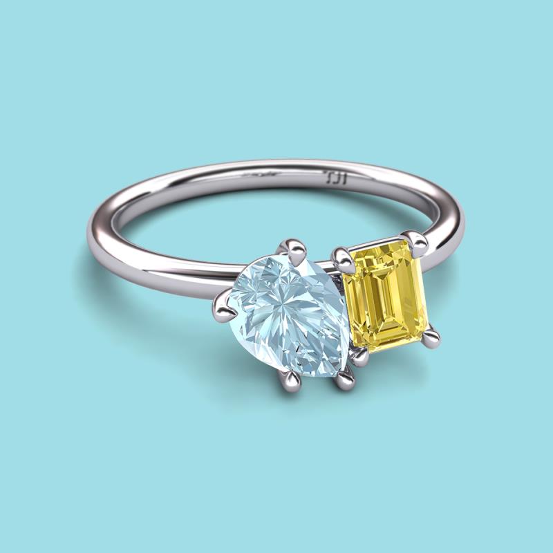 Find a beautiful symbol of everlasting love, with our new collection of duo two-stone ring. A pair of Pear Shape Aquamarine shimmering alongside of a luminous Emerald Shape Yellow Sapphire crafted beautifully is all set to represent two of you together.