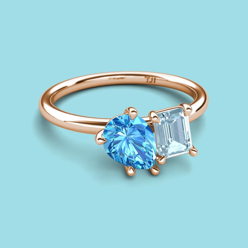 Find a beautiful symbol of everlasting love, with our new collection of duo two-stone ring. A pair of Pear Shape Blue Topaz shimmering alongside of a luminous Emerald Shape Aquamarine crafted beautifully is all set to represent two of you together.