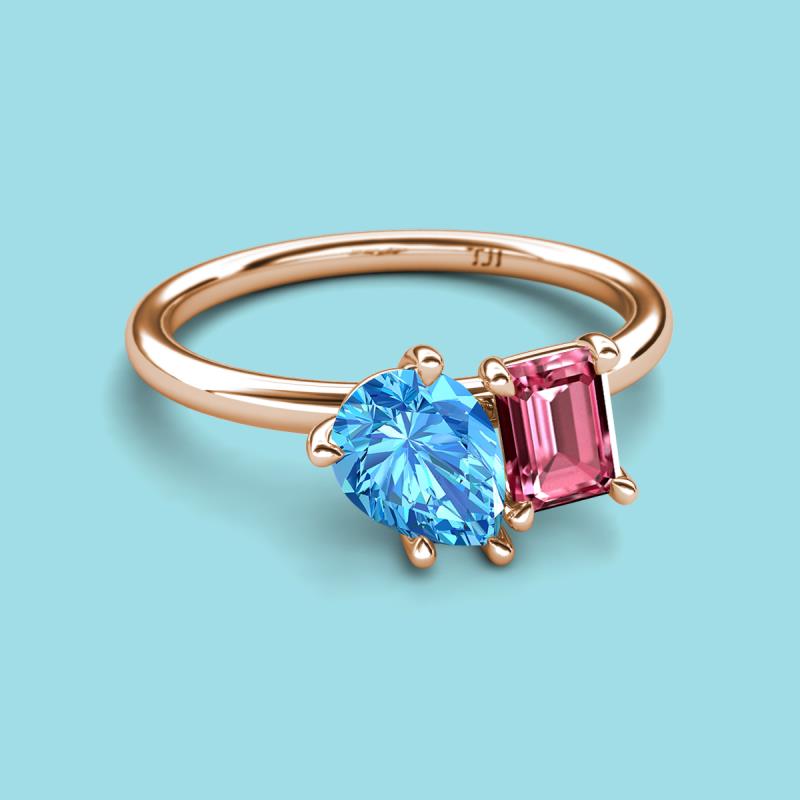 Find a beautiful symbol of everlasting love, with our new collection of duo two-stone ring. A pair of Pear Shape Blue Topaz shimmering alongside of a luminous Emerald Shape Pink Tourmaline crafted beautifully is all set to represent two of you together.