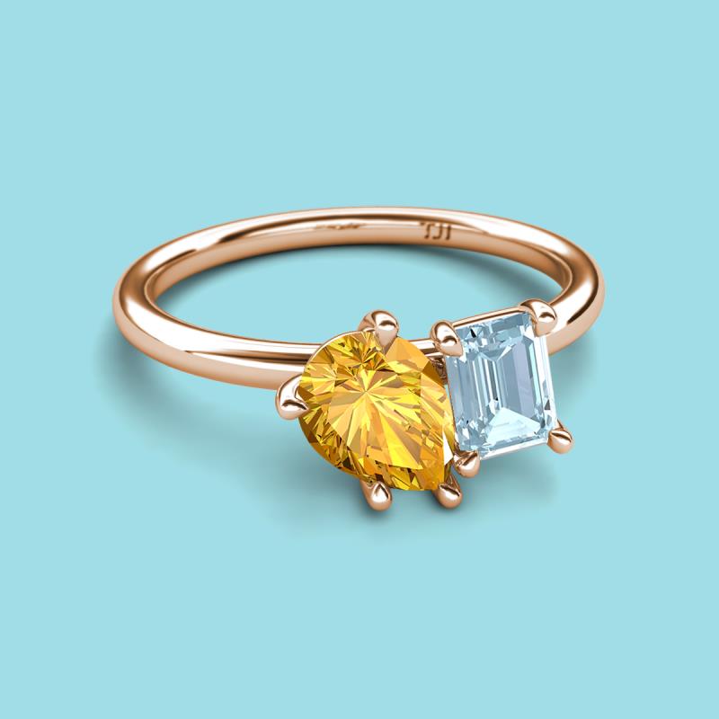 Find a beautiful symbol of everlasting love, with our new collection of duo two-stone ring. A pair of Pear Shape Citrine shimmering alongside of a luminous Emerald Shape Aquamarine crafted beautifully is all set to represent two of you together.