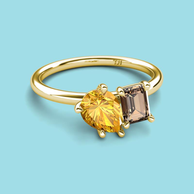 Find a beautiful symbol of everlasting love, with our new collection of duo two-stone ring. A pair of Pear Shape Citrine shimmering alongside of a luminous Emerald Shape Smoky Quartz crafted beautifully is all set to represent two of you together.
