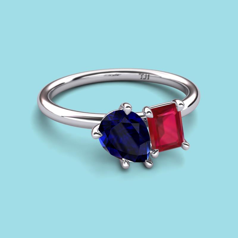 Find a beautiful symbol of everlasting love, with our new collection of duo two-stone ring. A pair of Pear Shape Lab Created Blue Sapphire shimmering alongside of a luminous Emerald Shape Ruby crafted beautifully is all set to represent two of you together.