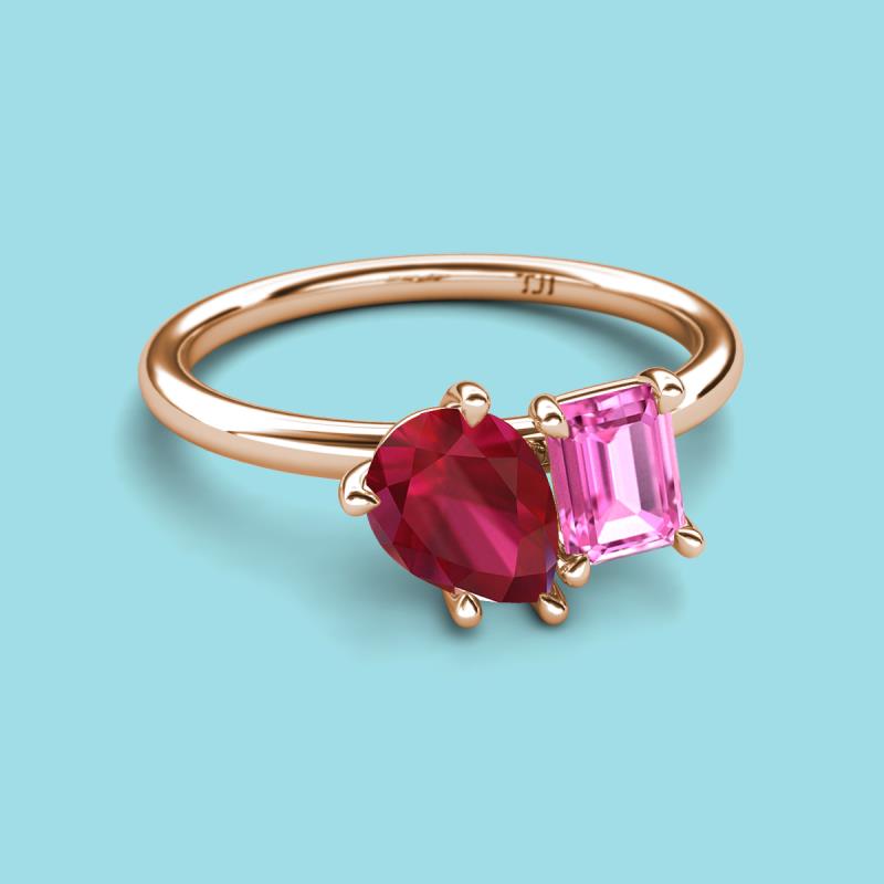 Find a beautiful symbol of everlasting love, with our new collection of duo two-stone ring. A pair of Pear Shape Created Ruby shimmering alongside of a luminous Emerald Shape Pink Sapphire crafted beautifully is all set to represent two of you together.