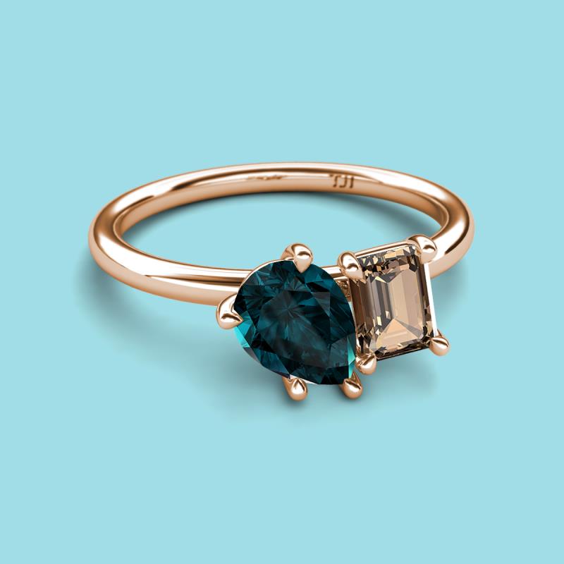 Find a beautiful symbol of everlasting love, with our new collection of duo two-stone ring. A pair of Pear Shape London Blue Topaz shimmering alongside of a luminous Emerald Shape Smoky Quartz crafted beautifully is all set to represent two of you together.