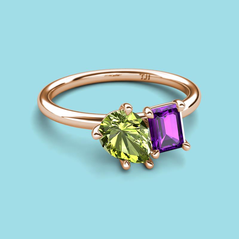 Find a beautiful symbol of everlasting love, with our new collection of duo two-stone ring. A pair of Pear Shape Peridot shimmering alongside of a luminous Emerald Shape Amethyst crafted beautifully is all set to represent two of you together.