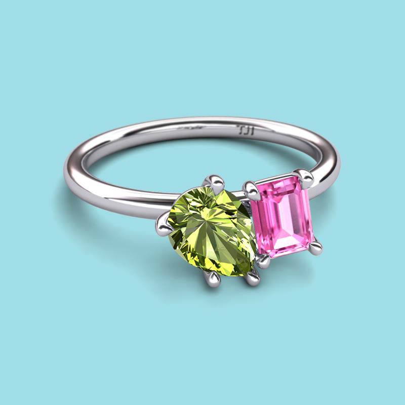 Find a beautiful symbol of everlasting love, with our new collection of duo two-stone ring. A pair of Pear Shape Peridot shimmering alongside of a luminous Emerald Shape Pink Sapphire crafted beautifully is all set to represent two of you together.