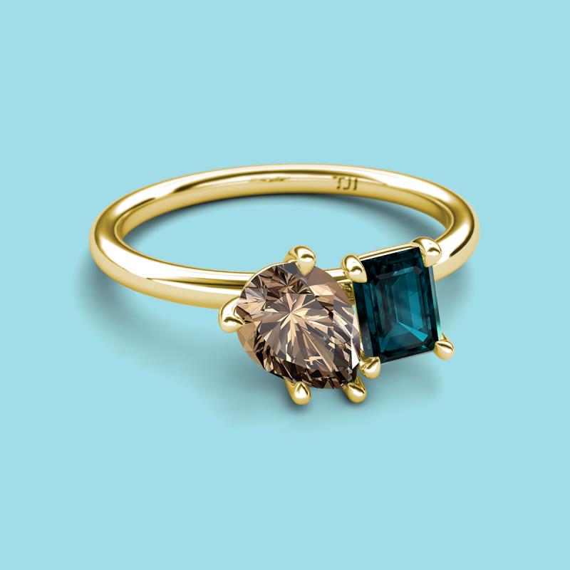 Find a beautiful symbol of everlasting love, with our new collection of duo two-stone ring. A pair of Pear Shape Smoky Quartz shimmering alongside of a luminous Emerald Shape London Blue Topaz crafted beautifully is all set to represent two of you together.