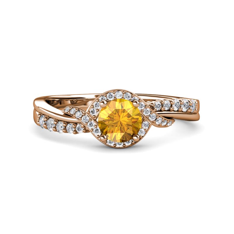 This Peg Head Engagement ring has 4 Prong Center Round Citrine wrapped by Bypass alternating crossover Shank with single row of Pave Set Diamonds in two type Setting.