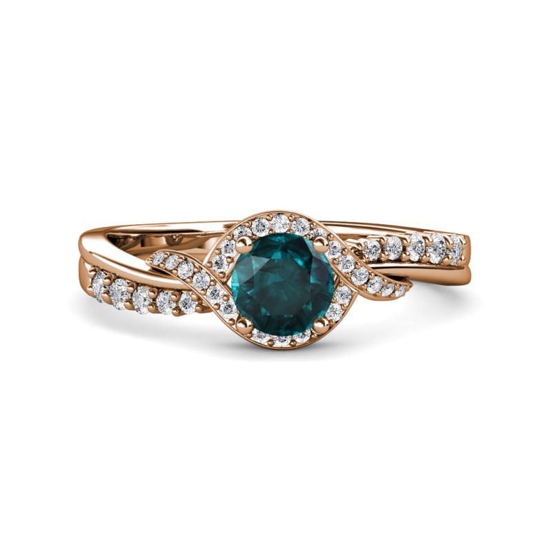 This Peg Head Engagement ring has 4 Prong Center Round London Blue Topaz wrapped by Bypass alternating crossover Shank with single row of Pave Set Diamonds in two type Setting.