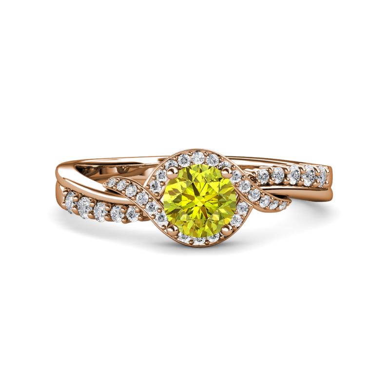 This Peg Head Engagement ring has 4 Prong Center Round Yellow Diamond wrapped by Bypass alternating crossover Shank with single row of Pave Set Diamonds in two type Setting.