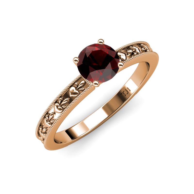 A perfect Ring to show your love and devotion, this Vintage inspired Red Garnet Solitaire Engagement Ring features motif of embossed hearts all around the shank with milgrain edges.