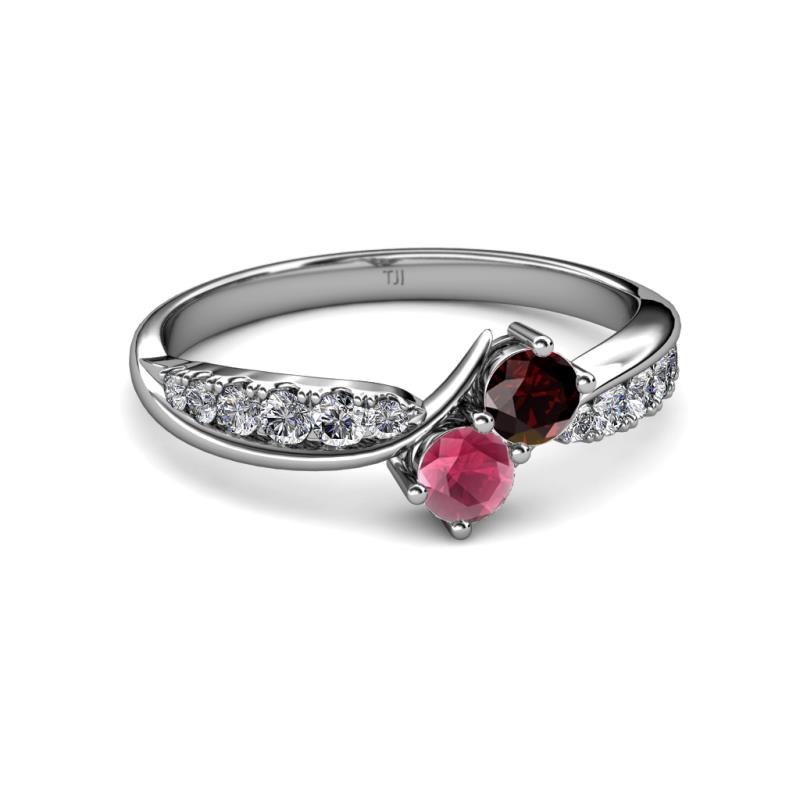 A Bypass Ring with a contemporary twist where Red Garnet & Rhodolite Garnet representing love & friendship are beautifully captured in the twisted split with Diamonds illuminating the shoulders signifying your unbreakable bond.