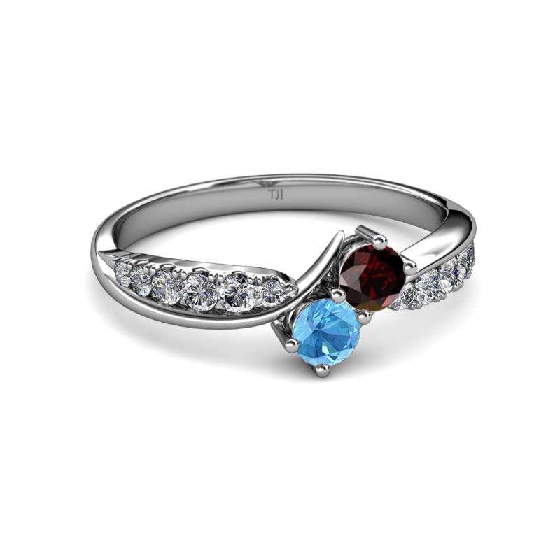 A Bypass Ring with a contemporary twist where Red Garnet & Blue Topaz representing love & friendship are beautifully captured in the twisted split with Diamonds illuminating the shoulders signifying your unbreakable bond.