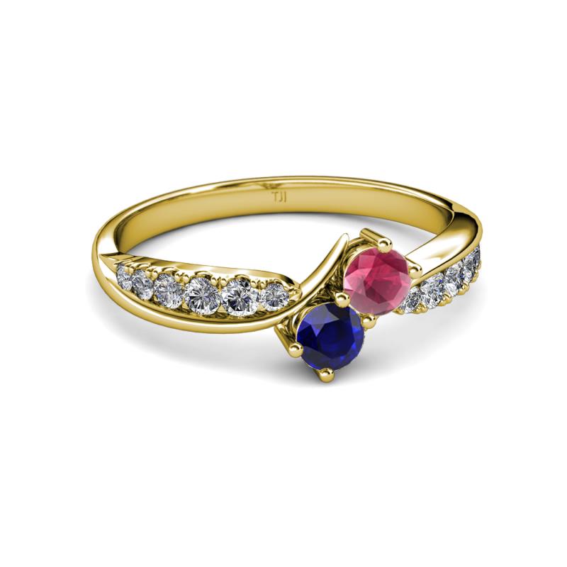 A Bypass Ring with a contemporary twist where Rhodolite Garnet & Blue Sapphire representing love & friendship are beautifully captured in the twisted split with Diamonds illuminating the shoulders signifying your unbreakable bond.