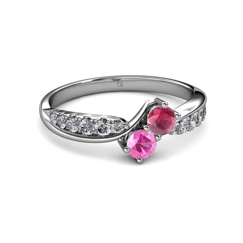 A Bypass Ring with a contemporary twist where Rhodolite Garnet & Pink Sapphire representing love & friendship are beautifully captured in the twisted split with Diamonds illuminating the shoulders signifying your unbreakable bond.