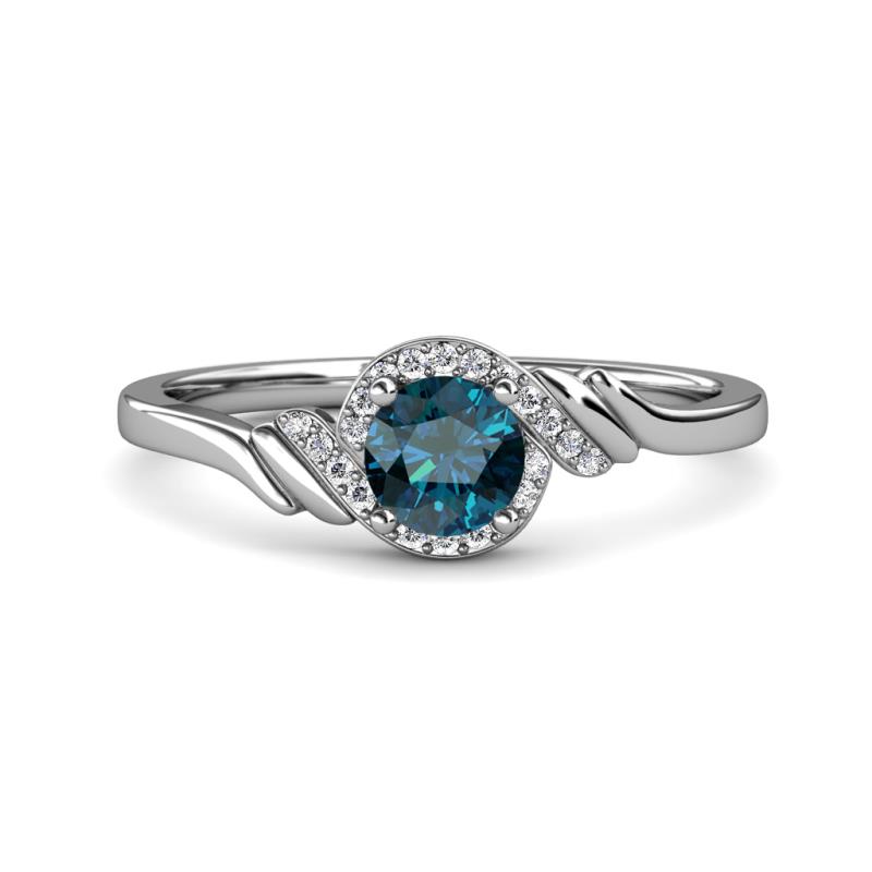 This Feminine style Engagement Ring features a 4 Prong Center Blue Diamond wrapped with single row halo of Pave Set White Diamonds and twisting bypass shank completes this sophisticated design.