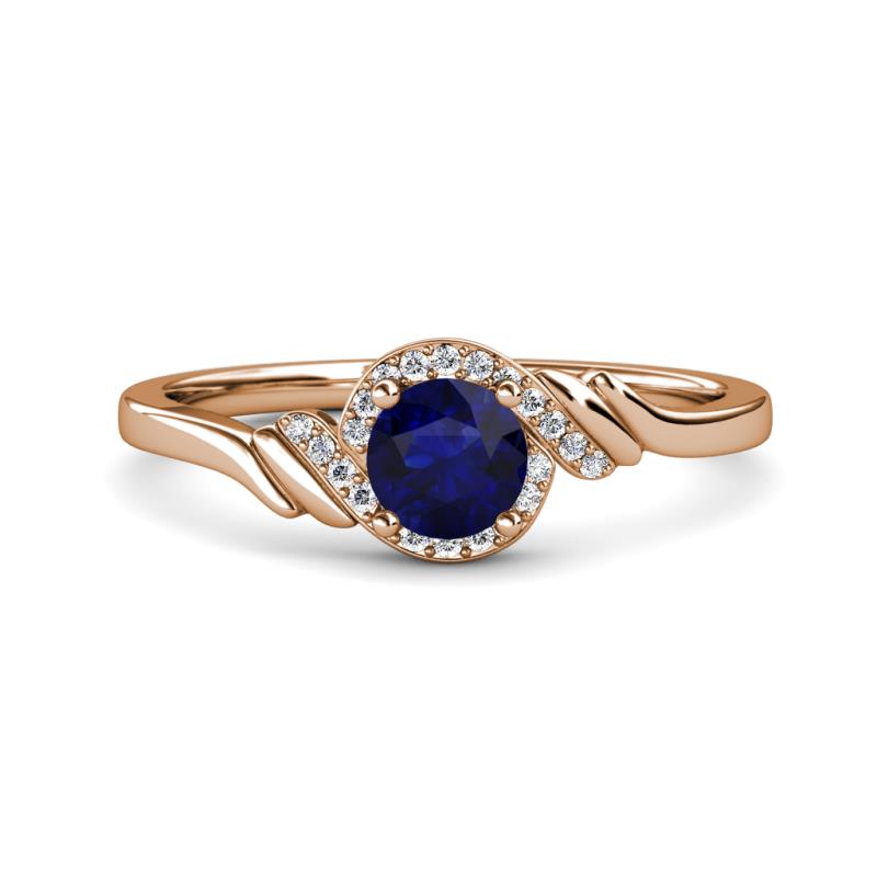This Feminine style Engagement Ring features a 4 Prong Center Blue Sapphire wrapped with single row halo of Pave Set Diamonds and twisting bypass shank completes this sophisticated design.