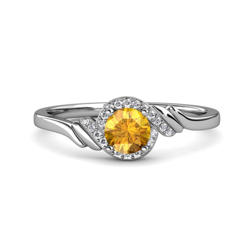 This Feminine style Engagement Ring features a 4 Prong Center Citrine wrapped with single row halo of Pave Set Diamonds and twisting bypass shank completes this sophisticated design.