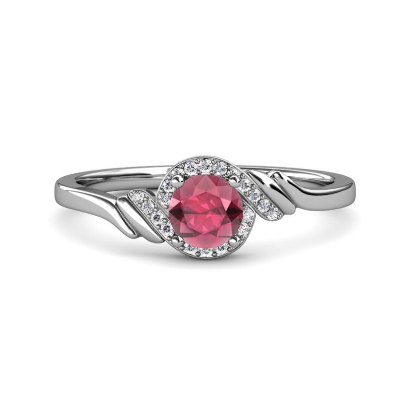 This Feminine style Engagement Ring features a 4 Prong Center Rhodolite Garnet wrapped with single row halo of Pave Set Diamonds and twisting bypass shank completes this sophisticated design.
