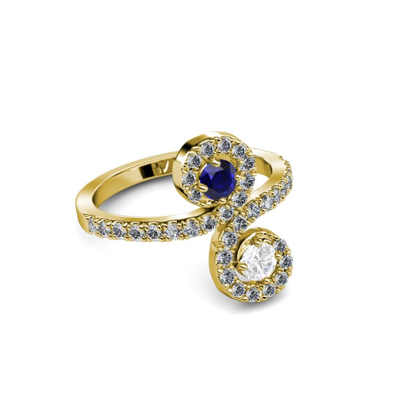 Blue Sapphire and White Sapphire 2 Stone with Side Diamonds Bypass Engagement Ring 0.74 Carat tw in 14K Yellow Gold. More Details ...