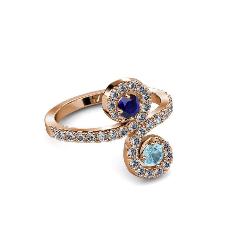 A divine symbol of togetherness, where one stone represents love and one friendship while each end of the ring swirls around the marvelous combination of Blue Sapphire & Aquamarine meeting above and below, rather than in the center.