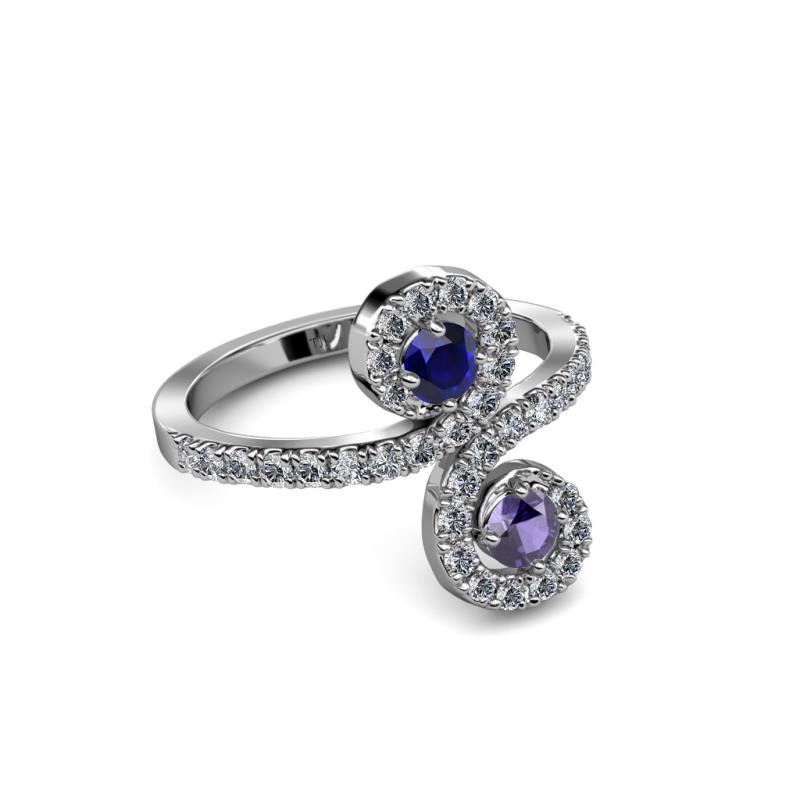 A divine symbol of togetherness, where one stone represents love and one friendship while each end of the ring swirls around the marvelous combination of Blue Sapphire & Iolite meeting above and below, rather than in the center.
