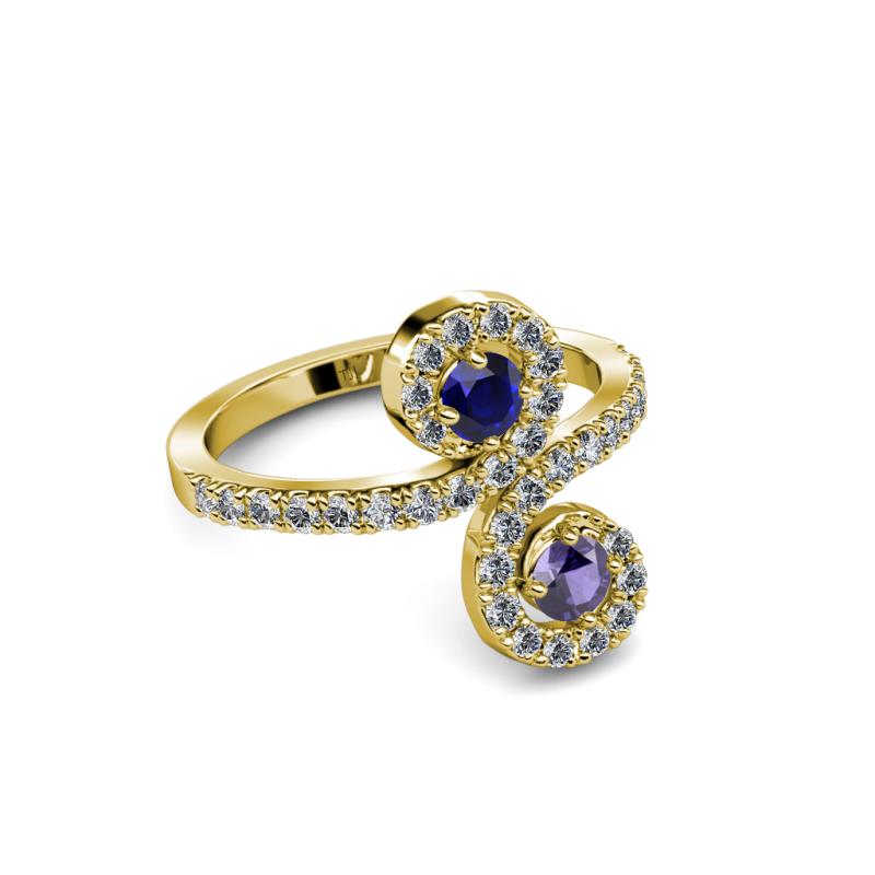 Blue Sapphire and Iolite 2 Stone with Side Diamonds Bypass Engagement Ring 0.72 Carat tw in 14K Yellow Gold. More Details ...