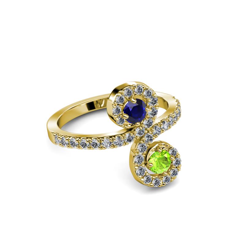 Blue Sapphire and Peridot 2 Stone with Side Diamonds Bypass Engagement Ring 0.75 Carat tw in 14K Yellow Gold. More Details ...