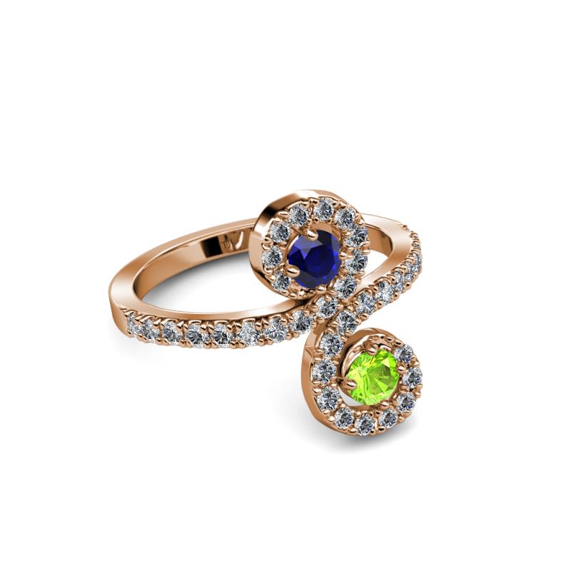 Blue Sapphire and Peridot 2 Stone with Side Diamonds Bypass Engagement Ring 0.75 Carat tw in 14K Rose Gold. More Details ...