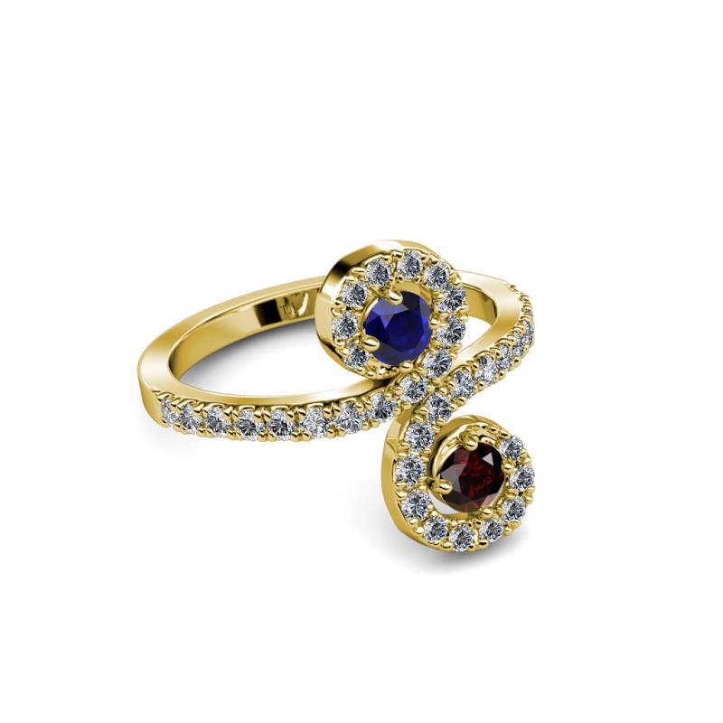 Blue Sapphire and Red Garnet 2 Stone with Side Diamonds Bypass Engagement Ring 0.75 Carat tw in 14K Yellow Gold. More Details ...