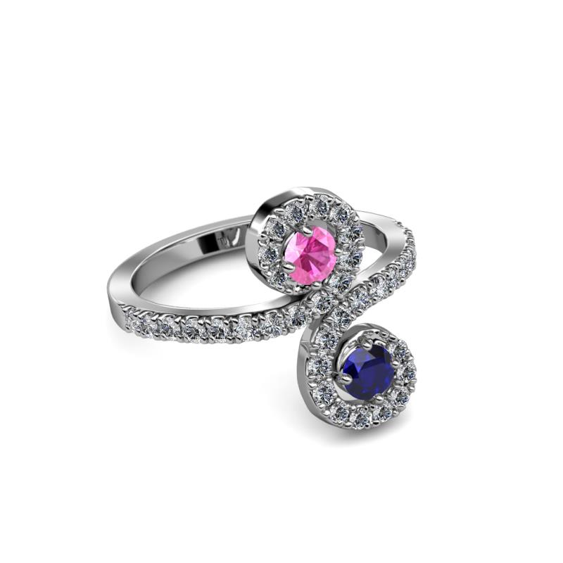 A divine symbol of togetherness, where one stone represents love and one friendship while each end of the ring swirls around the marvelous combination of Pink Sapphire & Blue Sapphire meeting above and below, rather than in the center.